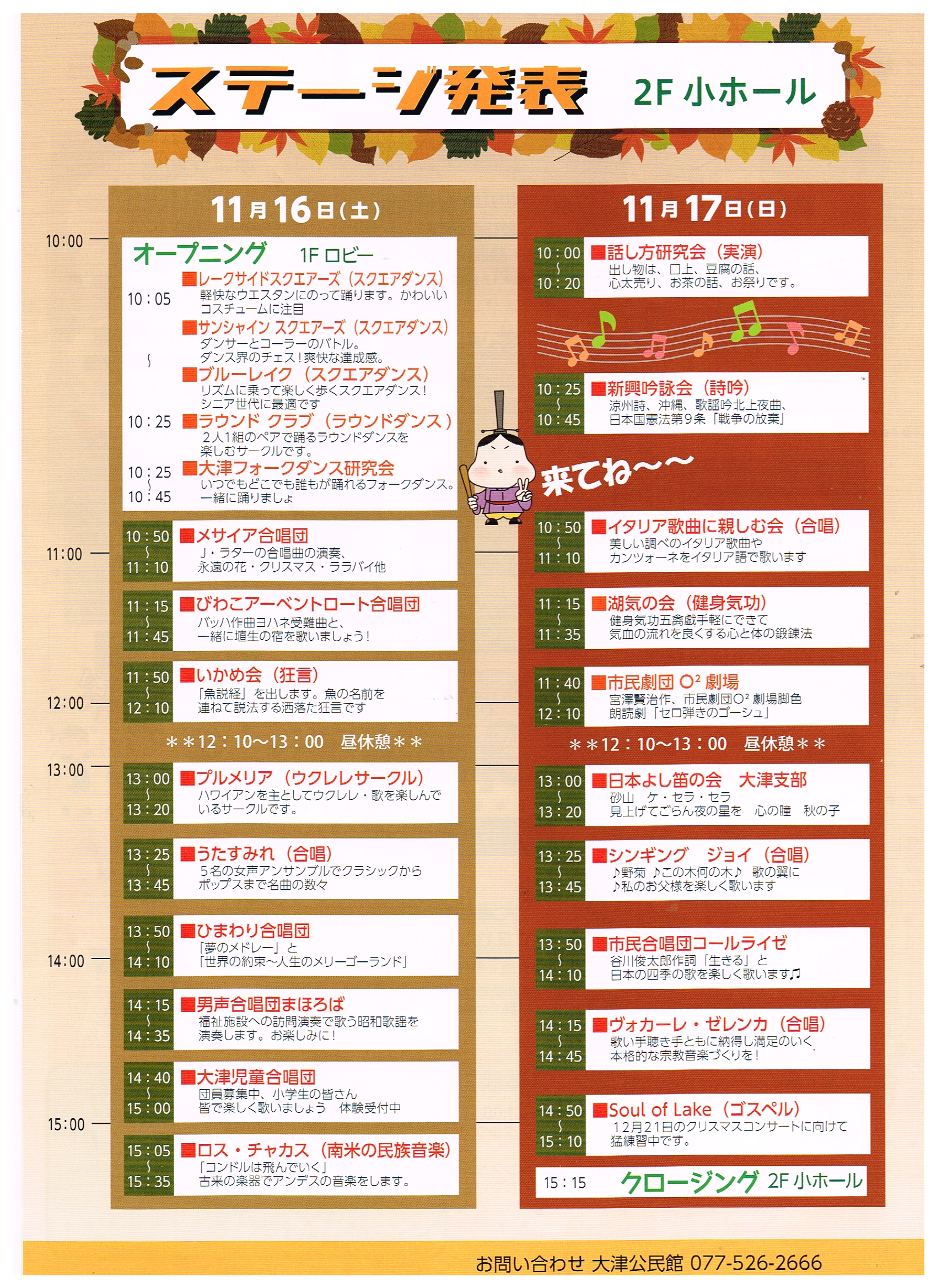 「まほろば」は,大津公民館利用者団体協議会の一員として,大津公民館文化祭にステージ参加しています。2024年度の文化祭は,11月16日(土)~17日(日)の2日間開催され,「まほろば」は,1日目の16日(土)のステージに出演しました。