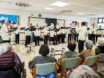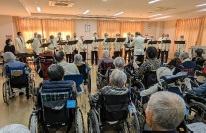 11 月 27 日,いつも通り午前中は大津公民館で練習し,昼食後 8 台の乗用車に分乗してえんゆうの郷へ向かいました。今回の訪問では,1 年前の皆さんとは別の入居者にお聴き頂きました。 ほとんどの方が車いすで,認知症の方も少なからずおられたようです。スタッフ5人程度含めて40名ほどの聴衆でした。吉田氏のMCのもと「栄冠は君に輝く」「夜明けのスキャット」「筑波山麓合唱団」など13 曲を岡本・小林の両指揮者で演奏しました。 前半は演奏への反応が少なかったですが,後半から少しずつ盛り上がり,全体では喜んで頂けたと思いました。余韻会は“café in the knot”で実施。