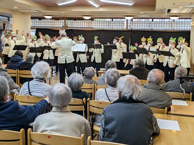 今回訪問したのは(住宅型有料老人ホーム)コンソルテ新緑苑。午前中に膳所公民館で練習してから訪問しました。スタッフの皆さんが演奏会の立派な看板を用意して我々を温かく迎えて下さいました。ふるさとの四季の冬の歌を皮切りに「雨の慕情」「シクラメンのかほり」など12曲の他“クリスマス特集”として「諸人こぞりて」「White Christmas」と皆さんとご一緒に「きよしこの夜」を歌いました。施設スタッフによるハンドベル演奏もあり,クリスマスに相応しい演奏会でした。聴衆はスタッフ含め約40名。MC は初登板の横田さん。今回の訪問演奏が24年度の6回目,通算157回目です。