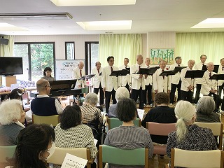 声がよく響き気持ちよく歌うことができました。演奏会が始まると,男声合唱の演奏と,MCの 野田伸治氏による語りかけで曲が進んでいきました。聴衆の皆様は,静かに演奏を聞いておられましたが,中には歌を一緒に口ずさむ方もあり,一緒にリズムを感じることができました。多数の団員が独唱をする「おさななじみ」の曲を訪問演奏で初めて披露しました。全12曲を演奏し,アンコールは,施設の希望による「津軽海峡冬景色」でした。