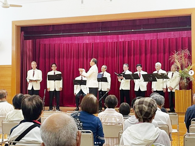 11月15日(土)に,大津公民館文化祭の小ホールにおいて,発表団体の発表プログラムの1つとして,まほろばの男声合唱の発表を行ないました。まほろばの持ち表時間は20分で,日頃より訪問演奏で歌っている曲の中から,「Sing Along」「ラジオ体操の歌」「もしもピアノが弾けたなら」「Birthday」「川の流れのように」の5曲を披露しました。この発表には,18名の団員が参加しました。