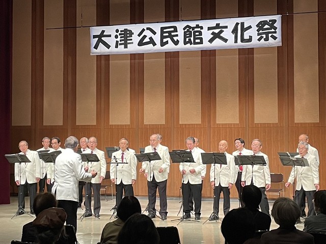 11月15日(土)に,大津公民館文化祭の小ホールにおいて,発表団体の発表プログラムの1つとして,まほろばの男声合唱の発表を行ないました。まほろばの持ち表時間は20分で,日頃より訪問演奏で歌っている曲の中から,「Sing Along」「ラジオ体操の歌」「もしもピアノが弾けたなら」「Birthday」「川の流れのように」の5曲を披露しました。この発表には,18名の団員が参加しました。