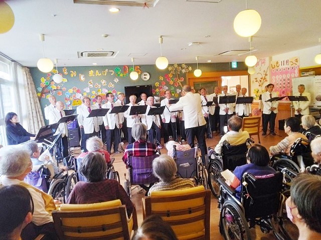 11 月 27 日,いつも通り午前中は大津公民館で練習し,昼食後 8 台の乗用車に分乗してえんゆうの郷へ向かいました。今回の訪問では,1 年前の皆さんとは別の入居者にお聴き頂きました。 ほとんどの方が車いすで,認知症の方も少なからずおられたようです。スタッフ5人程度含めて40名ほどの聴衆でした。吉田氏のMCのもと「栄冠は君に輝く」「夜明けのスキャット」「筑波山麓合唱団」など13 曲を岡本・小林の両指揮者で演奏しました。 前半は演奏への反応が少なかったですが,後半から少しずつ盛り上がり,全体では喜んで頂けたと思いました。余韻会は“café in the knot”で実施。
