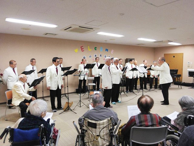 声がよく響き気持ちよく歌うことができました。演奏会が始まると,男声合唱の演奏と,MCの 野田伸治氏による語りかけで曲が進んでいきました。聴衆の皆様は,静かに演奏を聞いておられましたが,中には歌を一緒に口ずさむ方もあり,一緒にリズムを感じることができました。多数の団員が独唱をする「おさななじみ」の曲を訪問演奏で初めて披露しました。全12曲を演奏し,アンコールは,施設の希望による「津軽海峡冬景色」でした。